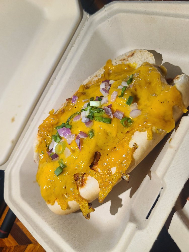 Jumbo Impossible Hotdog Smothered in Frank's Famous Chili, Topped with House Cheese Sauce, White Onions, and a Hot Yellow Pepper, Served on Steamed and Mayo Toasted Bun. (Vegan)