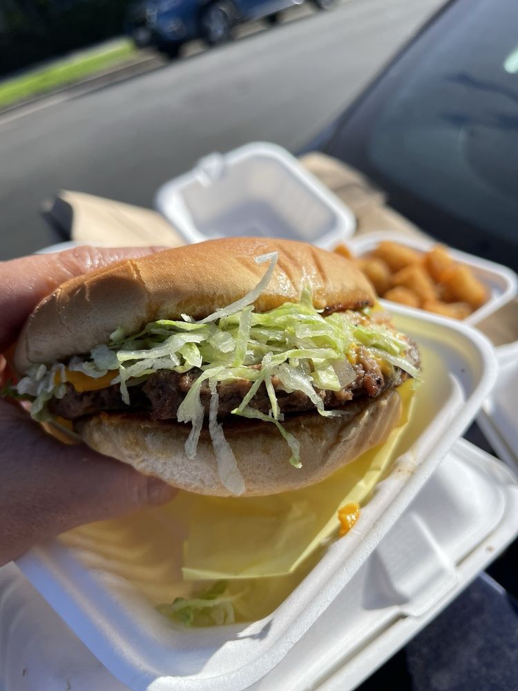 Smashed Impossible Burger Patty, American Cheese, Yellow Mustard, Shredded Lettuce, Diced Caramelized Onions, House Spread, Served on Steamed and Mayo Toasted Bun. (Vegan)