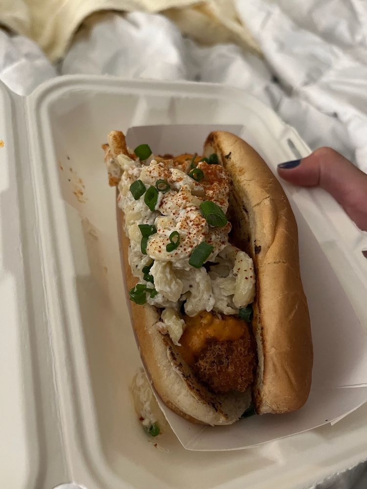 Jumbo Impossible Hotdog Hand Breaded and Deep Fried, Topped with Spicy Mayo, Catsu Sauce, Island Mac, Green Onion, Smoked Paprika, Served on a Mayo Toasted Bun. (Vegan) Made In collaboration with Lucky Catsu