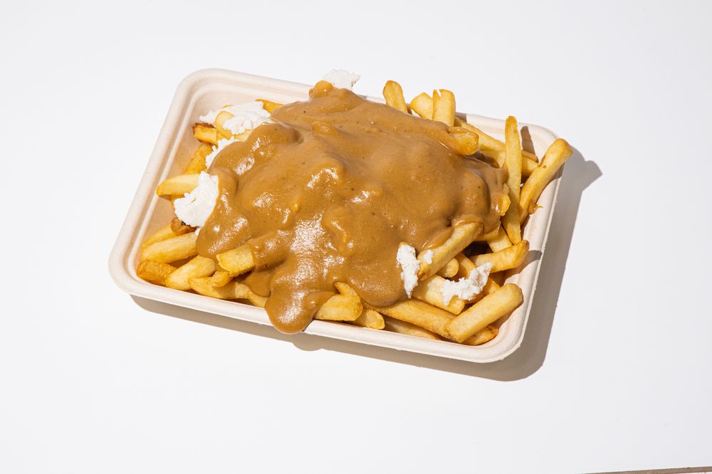 A Bed of French Fries topped with Cheese Curds and Hot Brown Gravy. (Vegan)