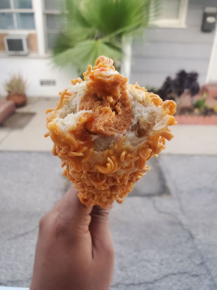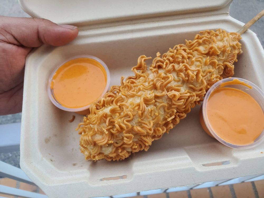 Jumbo Impossible Hotdog on a Stick Hand Dipped in House Made Yeasted Dough rolled in Ramen. (Vegan)