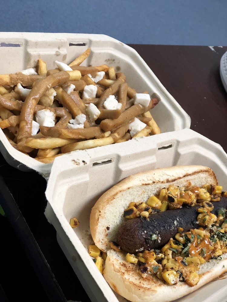 Field Roast Chipotle Sausage chopped with Sweet Corn, Chipotle Mayo, Cotija Cheese, Fresh Cilantro and Sliced Lime served on a bed of Fries. (Vegan)